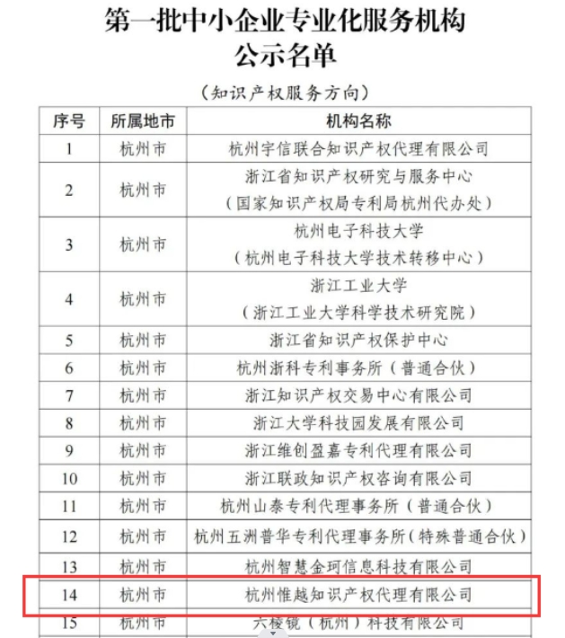 喜報(bào)??!關(guān)于杭州惟越知識(shí)產(chǎn)權(quán)代理有限公司入選浙江省首批中小企業(yè)專(zhuān)業(yè)化服務(wù)機(jī)構(gòu)的公示